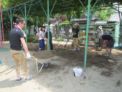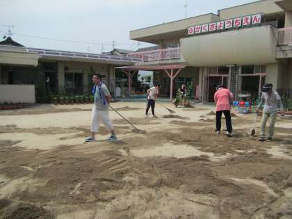 園庭が雨のため,凸凹状態でした。子どもたちが思いきり走ったり,遊んだりできるように砂を運び,埋めていただきました。言葉でいえば一言なのですが,穴を埋める作業は難しく,「ここが穴になっているような」と思って砂(土)を入れても「あれ?ここでよかったかな」と。おやじの会の方々が土を運んだり,とんぼで土を平らに押さえたり,トンボブラシをかけたり…。