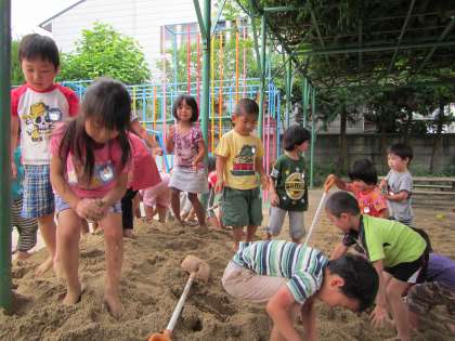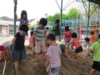 幼稚園の砂場の砂を2tトラックで2台分運んでもらいました。先日の土曜参観の後の園庭整備で,園庭をならすのに,砂場の砂を半分くらい,お父さんの力で運び出してもらったので,砂場には大きな大きな穴があいていました。その穴をさらに掘って遊ぶことも楽しかったのですが,目の前で,トラックから大量の砂が流れ出てくる様子に,子どもたちは大興奮!大きな砂山にさっそく登ったり,「ふかふかや!」と触ったり足を埋めたりして遊びました。たくさんの量を感じ,また普段できないような砂遊びの体験ができました。