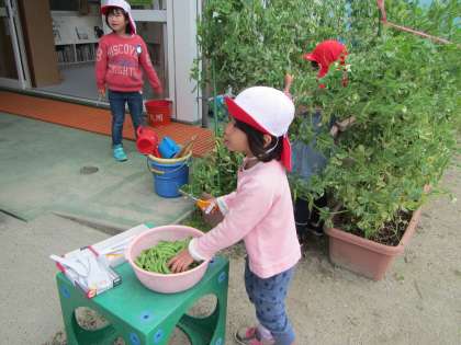 昨年まいたスナップエンドウの実がたくさんできました。年度末から収穫を始めましたが,次々と実がふくらんでいます。何度も収穫をしているので,どの部分をはさみで切ればよいかをちゃんと知っている子どもたちです。今日はいくつとれたかな。100個以上はあったかな。豊作です。