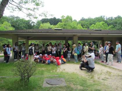 みんなの祈りが届いたように,今日は晴れ間も見られるお天気となりました。今年度の親子遠足は宝ヶ池公園のいこいの森広場で始まりました。