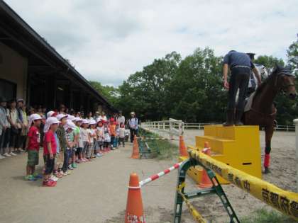 まず,友達見つけゲームを親子で楽しみました。そのあと,京都府警察 平安騎馬隊の馬を見学させてもらったり,一人ずつ騎乗体験をさせていただきました。普段はなかなかできない体験に,子どもたちからは,