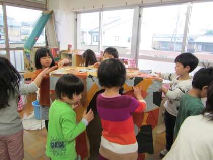 今日は『ジャックと豆の木』の劇遊びに使うかまどをつくりました。鬼に見つからないようにジャックがかくれるためのかまどです。「かまどって石でできてるし,紙を貼ろう」という提案で,みんなで色画用紙を石の形にビリビリ破り,糊で貼りました。みんなで劇遊びをつくろうという気持ちがどんどん高まってきています。子どもたちの姿をとてもうれしく感じています。