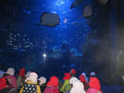 年長組にとっては,幼稚園最後の遠足。年少組にとっては,大好きな年長児,そして大好きな幼稚園兄弟と手をつないで出かける最後の遠足でした。京都水族館で,海の生き物をたくさん見て,イルカショーに心動かしました。そして,帰りの道中では,