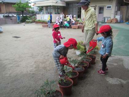 幼稚園では,いろいろな花や野菜に関心をもったり,生長を楽しみにしてお世話をしたりする経験を大事にしたいと,自分の植木鉢に苗を植え,野菜や花を育てています。