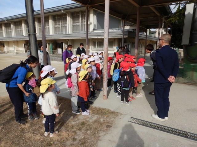今日は、未就園児3歳児と、4・5歳児が初めて一緒に近隣の深草中学校へ凧揚げに出かけました。3歳児にとって園外に出かけるのは2回目。幼稚園で一番お兄さんお姉さんの5歳児に手をつないでもらいながら歩きました。いつも5歳児に支えてもらっていた4歳児は、今日は4歳児同士で手をつなぎ、お互いに支え合いながら歩きました。到着すると、深草中学校の先生方が待っていてくださいました。ご挨拶をした後、グラウンドの広さにみんなびっくり!「こんなに広いの~?!」とワクワクが止まらず、荷物置くと急いで自分の手作り凧を持ってグラウンドに駆け出しました。グラウンドの広さはもちろんのこと、今日はいつもより風が吹いていたこともあり、ビニール袋がパンパンに膨れて揺れる凧に3歳児は大喜び!4・5歳児の凧は、糸をめいっぱい伸ばせば伸ばすほど、ぐんぐんと空に舞い上がり「見て見て~!」「すごーい!」「じっとしてても勝手に揚がる~」「わぁ!手を離したら飛んでっちゃう~」と大歓声!寒い日でしたが、時間いっぱい楽しみました。深草中学校の皆様、本当にありがとうございました。