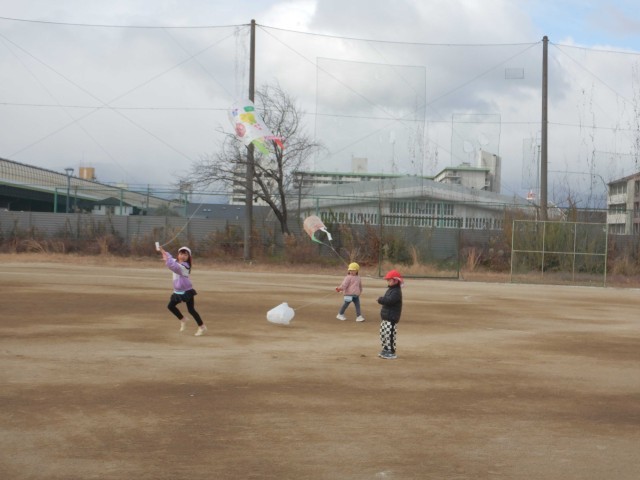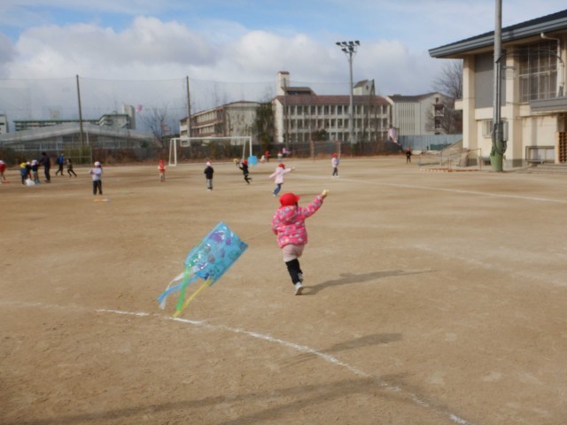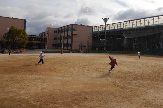 中学校のグラウンドで凧揚げをしたよ(3・4・5歳児)