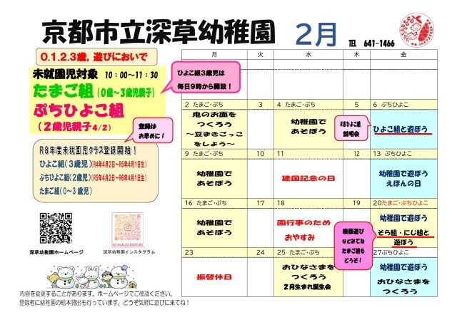 教育相談(未就園児)たまご組・ぷちひよこ組・ひよこ組2月予定