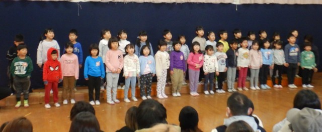 プログラム3番 5歳児が 『一ねんせいになったら』『にじのむこうに』を歌いました。さすが年長児、と言わんばかりの力強さと美しさのある歌声を遊戯室に響かせました。