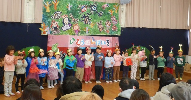 プログラム2番 4歳児の劇遊び お話『ぽんたのじどうはんばいき』より。今日はいつもと違ってお家の人に見てもらっていることが何より楽しくて、自分のお気に入りの役になりきって歌ったり、踊ったり、言葉のやりとりをしたりして、存分に楽しみました。