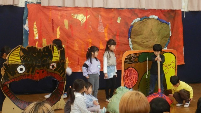 プログラム5番は、5歳児の劇遊び『じごくのそうべえ』より。4歳児とは違って、登場人物になりきって一人で言うセリフもあり、大道具を出し入れする役もあり、友達と協力して、火車や火の粉、大きな湯釜などの登場する”もの”を身体表現する場面もあり…と、一人何役もこなしました。今日は、お客様の歓声や思わず笑みがこぼれる姿を見て、子どもたち自身も、どんどん楽しくなってきて、のびのびと自信をもってクラス全員でやり遂げる姿が印象的でした。