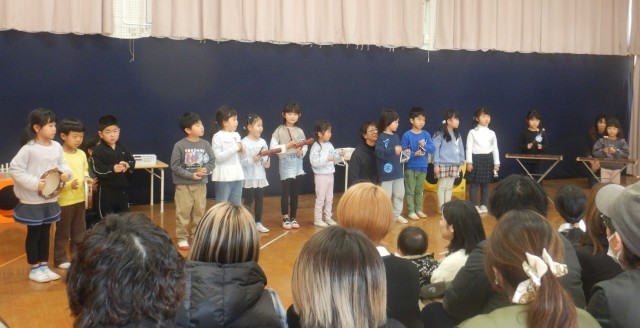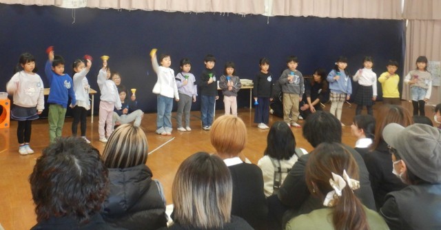 最後のプログラムは、5歳児の合奏でした。ハンドベルで和音を奏でたり、打楽器を使って心を合わせて分担奏をしたりしました。真剣に自分のパートを演奏する姿、最後に花道を堂々と歩いて退場する姿に、大きな大きな拍手をいただきました。