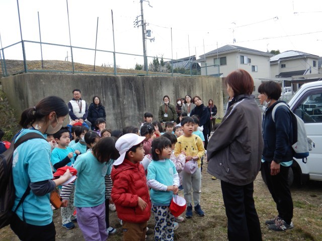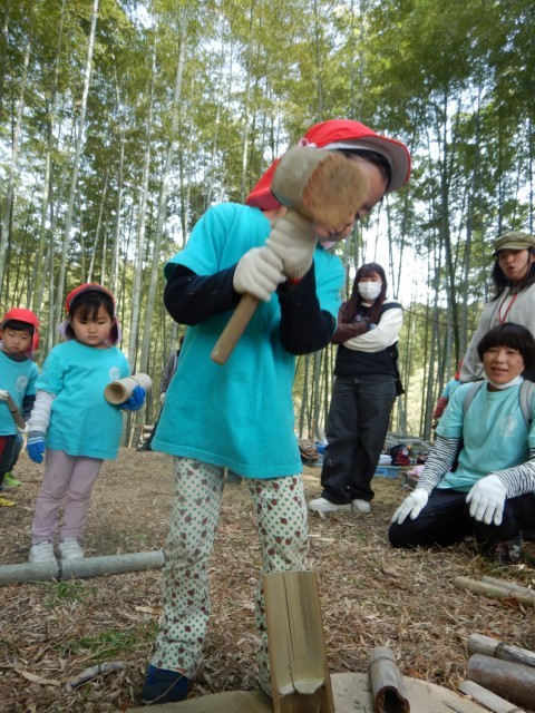 今日は、深草幼稚園にとって身近な地域の竹林『ふかふか竹林』へ4・5歳児で出かけました。年3~4回ほど出かけますが、5歳児にとってはこれが最後の竹林でした。”幼稚園きょうだい(異年齢ペア)”と一緒におしゃべりしながら歩き、いつもお世話になっている地域の方と再会しました。竹林へ向かう道中、ゴミ拾いをしたり、竹林の中の石拾いや草引きなどの竹林保存活動をしたりすることにもずいぶん慣れてきました。今日は、その後、竹林内の斜面で竹を転がして遊ぶことに加え、初めての活動『竹割り』にも挑戦させていただきました。木づちで何度も何度も竹を叩いていると、ある時パーン!といういい音と共に竹が見事に割れる様に、「もう一回やりたい」と行列ができるほどでした。この『ふかふか竹林』での自然体験は、もしかしたら今後の子どもたちの人生において、今しか味わえない体験となる子どももいるかもしれません。地域に豊かな環境があるありがたさ、温かい地域の方の支えのもと本物の体験が味わえる喜びを改めて感じます。それは、希望して参画くださった保護者の方にもお感じいただけたのではないでしょうか。最後は、5歳児から「今までお世話になり、ありがとうございました」、4歳児から「また会いましょう」とご挨拶をして別れました。地域の皆様、一年間本当にありがとうございました。そしてまた来年も新4・5歳児のこと、どうぞよろしくお願いいたします。今日、ご参加いただきました保護者の皆様も、朝からありがとうございました。
