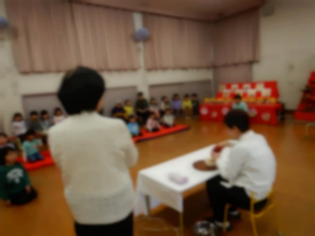 大正琴の演奏を聴きながら、自分たちのつくったひな飾りが飾られた遊戯室に入りました。今日はピアノではなく、大正琴で伴奏をしていただき、『たのしいひなまつり』の歌をみんなで歌いました。和の雰囲気を感じながら、素敵な歌声が響きました。