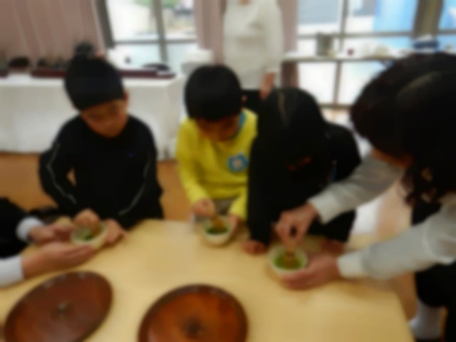 にじ組の子どもたちは抹茶を初めて口にする子どもも多く、ドキドキしながらも先に干菓子をいただきました。「甘いね」「おいしいね」と口に甘い味が広がったところで抹茶をいただきました。「おいしい」という子どももいれば、苦さを感じている様子の子どももいました。抹茶の味を知る機会になりました。いただいた後は「結構なお点前でした」と挨拶をしました。