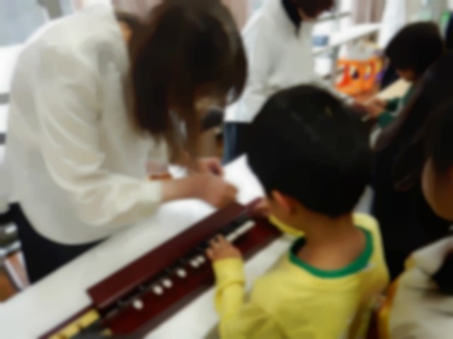 最後には大正琴を鳴らす体験もさせていただきました。ボタンを押しながら弦を弾くことを教えていただき、きれいな琴の音が響いていました。