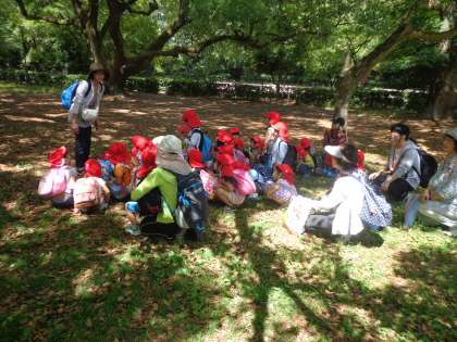 6月6日(火),たんぽぽ組とすみれ組は,園外保育で京都御苑に行きました。たんぽぽ組さんは,地下鉄に乗る初めての園外保育で,とても楽しみにしていました。お休みの友だちもいましたが,幼稚園家族のペアになって歩いたり,地下鉄に乗ったりしました。