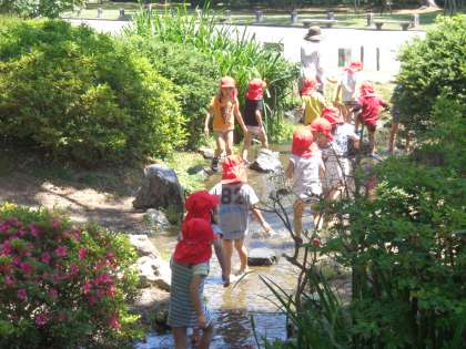 京都御苑に着くと,先生から京都御苑での過ごし方や遊びの話を聞いて,それから楽しみにしていた小川に入っての水遊びをしました。