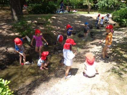 川の中を歩いたり走ったり,アメンボを探したり,水の流れてくるところを探したり,子どもたちは思い思いの遊びを楽しんでいました。