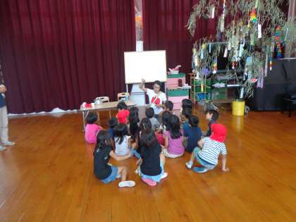 幼稚園で,4つのグループが見つけた巻物から分かった文字をあわせると「ふじだな」という言葉になりました。