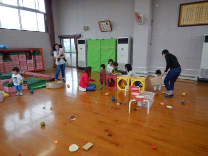 6月6日(水),予定では「園庭で遊ぼう」でしたが,雨のため,遊戯室で遊びました。すべり台をつくって滑ったり,ゲームボックスを組み合わせてくぐったり,小さなおもちゃで遊んだりしました。幼稚園のおともだちは,1階で遊んだり,収穫したジャガイモを数えていたりしたので,遊戯室を広く使って遊ぶことができました。