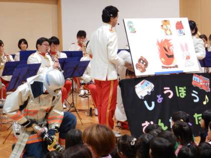 消防音楽隊からは,子どもたちがよく知っているアニメや童謡の曲の演奏がありました。曲に合わせて,子どもたちも歌って一緒に楽しみました。また,パネルシアターで楽しいお話や防火のお話を聞きました。冬は火を使うことが増えるから,絶対子どもだけで火を使わないようにしようね。