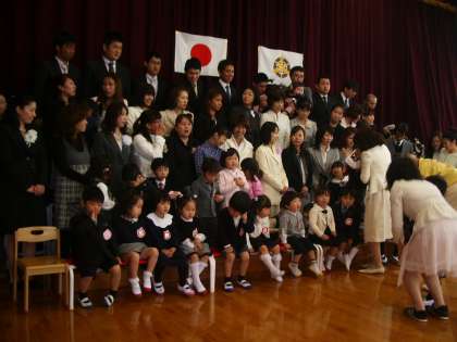 入園式後,ちゅうりっぷ組の子どもたちとお家の人たちは遊戯室で写真撮影です。「みんなカメラの方を見て・・・はいっ!」といっぱい撮ってもらいました。その後,たんぽぽ組の新入園児も写真撮影をしました。