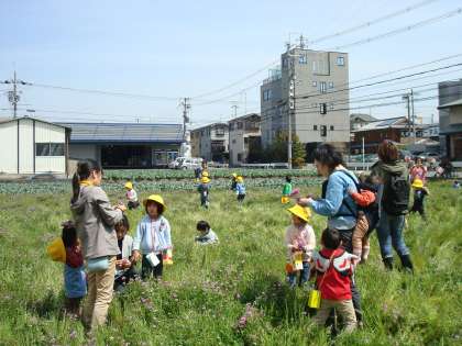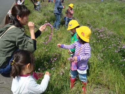 良い天候にめぐまれ,4歳児と5歳児が地域の畑へれんげ摘みに出かけました。今年度はじめての遠足です。保護者の皆さんにも誘いかけると参加される方がたくさんあり,皆で移動しました。安全に歩けるように見守っていただき,ありがとうございました。