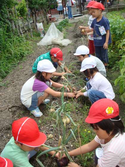 5歳児のすみれ組の子どもたちが,昨年度てんとうむし広場に植えた玉ねぎを今日,収穫しました。白い玉ねぎと紫色の玉ねぎができると苗を植えた時から茎を見て楽しみにしていました。できた玉ねぎの大きさはさまざまでしたが,立派な玉ねぎになっていて友達と一緒に力を合わせて掘り上げた時は歓声が上がりました。