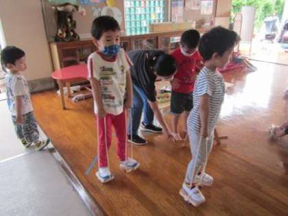 たくさん歩けるようになると,うれしくって年少組の保育室まで歩いてみたり,園内を一本歯下駄で散歩したりして楽しんでいました。