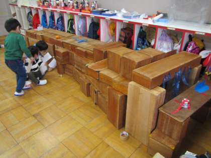 積み木で毎日遊ぶことを楽しんでいるたんぽぽ組ですが,今日はなんと積み木のトンネルができました。