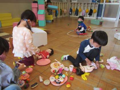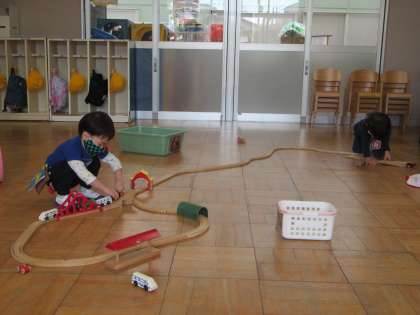 朝の支度を先生と一緒に済ますと,さっそく保育室のままごとや積み木,電車のおもちゃなどで遊び出しました。