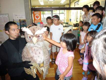 真夏の暑い日でしたが,すぐにお話の世界に引き込まれ,冬の雪の中の森にいるかのようでした。ひきがえるのウォートンやみみずくのジョージが話すたびに子どもたちも同じようになりきって声をだしてみたり,ちょっと怖い場面では泣き出してしまったりしました。お家の人と一緒に楽しいひと時をもつことができました。