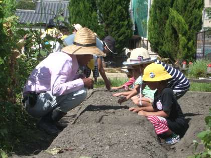 前日に、畑の先生・西嶋さんがトラクターで,てんとうむし広場の畑を耕し,ふかふかの畝を作ってくださいました。いよいよ,大根の種まきです。今日も,西嶋さんが来てくださいました。すみれ組の子どもたちは,種のまき方を教わりました。種は,小さくって,オレンジ色。カップに種を入れ,二つぶずつまきました。それから,そっと土をかけました。次は,水やりです。「水たまりができないように,水をまくんだよ」と教えてもらい,子どもたちは,じょーろでそっと,種が植わっているところに水をまきました。土がぬれていく様子を見ながら「大きくなあれ・・・」と思いをこめてまきました。