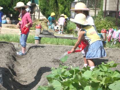さて,明日から大根の畑の様子を見ながらの生活が始まります。登園してきたらまず,畑に出かけます。芽が出るまで水は欠かせません。すみれ組さん。お世話をお願いします。広場の畑の半分以上は大根畑です。これから大根の生長と共に,心を揺さぶられる生活が続いていくことでしょう。楽しみです。