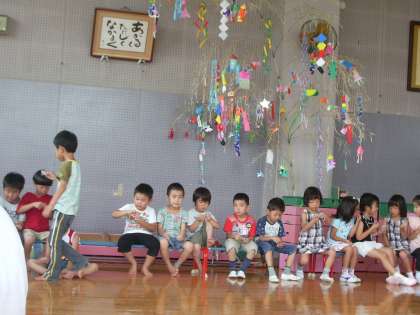 子どもたちがつくった七夕飾りをつけた大笹を遊戯室に運び入れ,七夕の集いをしました。七夕のお話を聞いたり,お星さまに願いが届くように,願いを込めてお星さまのおかし(こんぺいとう)を食べたりしました。今年は特別に,改進保育所の年長児も一緒に七夕の集いに参加してもらいました。