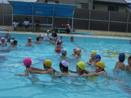いつもよりずっと広いプールで,ロンドン橋をしたり,ビート板にのったり,触れ合いを楽しみながら遊びました。