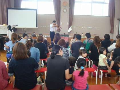 1部は,ミニ音楽会。ディズニーの音楽を聞きました。ピアノ・バイオリン・クラリネットの演奏です。楽器の美しい音色が遊戯室いっぱいに広がりました。演奏していただいたお兄さん・お姉さんありがとうございました。3歳児ちゅうりっぷ組も参加し,聞き入っていました。入園して,半年が過ぎる3歳児の姿からは「大きくなったな」「成長したな」と感じたひと時でした。