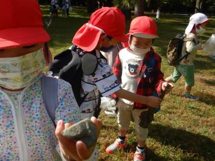 京都御苑に到着すると,どんぐりや松ぼっくり,木の枝や皮,変わった形の石など,素敵なものをたくさん集め,お家の人と一緒に用意してきた袋にたくさん入れていました。「これで,楽器つくろうよ!」「(幼稚園の)虫さんの家に入れてあげたら,喜ぶんじゃない?」「お母さんのお土産にする!」などなど・・・口々に言いながら集めていました。