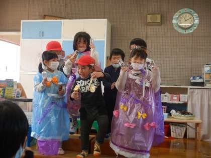 楽器が出来上がると,この前まで遊んでいたレストランごっこの遊びを組み合わせ,レストランのコンサートごっこが始まりました。お客さんになると,ご飯を食べながら,お店の妖精たちのコンサートが聞けるのです。コンサートの中では,友達と鳴らし方を合わせようとしたり,いろんな動きを自分たちで考えたり・・・と,友達と息を合わせて演奏したり,踊ったりする姿がとても可愛らしいです。