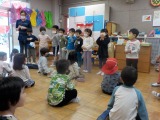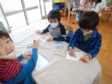 今日は,年長組がポップコーンパーティーのチケットをたんぽぽ組とちゅうりっぷ組に,配りに来てくれました。