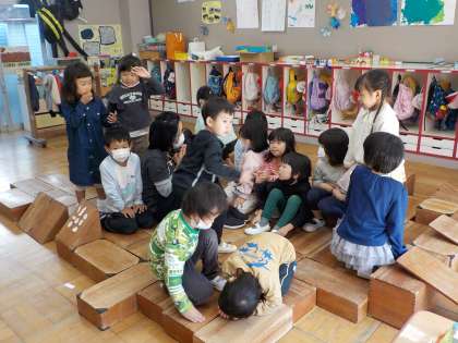 4歳児たんぽぽ組に,積木で大きな船が出来上がりました。船をつくった子どもたちが,クラスのみんなにも乗ってもらいたいと言うので,片づけをした後に,みんなで乗せてもらいました。