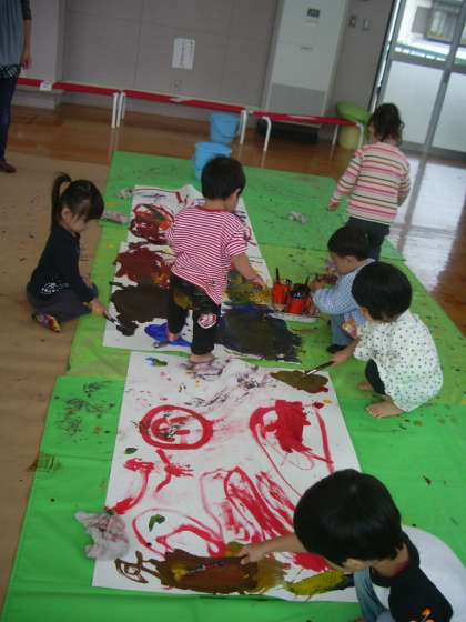 後半は,大きな紙に絵の具遊びをしました。ふと筆でかくと,紙に絵の具が広がるのが面白かったようです。色が混ざっていく様子を,先生と一緒に楽しんだうさぎ組さんもいました。