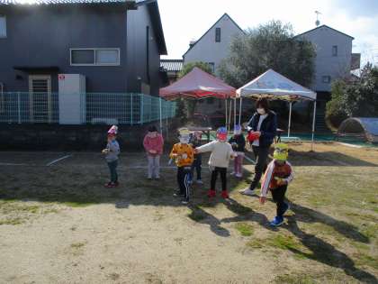 節分の由来の話を聞いたり,紙芝居を見たりして楽しみました。また,幼稚園に鬼がやってこないように,自分の体の中にいる鬼を退治できるようにと,みんなで豆まきをしました。今年も一年,みんなが元気で過ごせますように…。