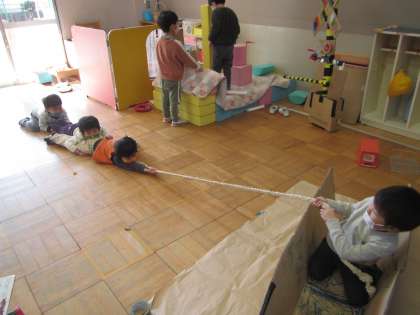「ロープにつかまって!」と頼もしく,ロープを引っ張りながら消防隊ごっこを楽しんでいました。