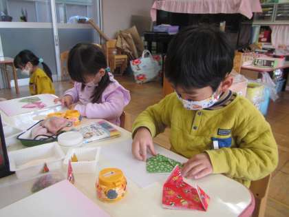 今日ちゅうりっぷ組では,折り紙などを使って自分のおひなさまをつくりました。