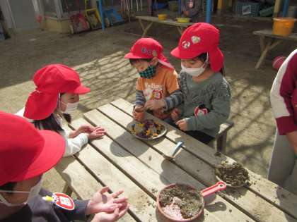 ちゅうりっぷ組の子ども達も,腕まくりをして,じょうろに水を汲んだり,流したりしながら砂場で遊ぶ姿が再び見られるようになってきました。