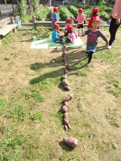 てんとうむし広場でサツマイモ掘りをしました。4歳児のたんぽぽ組が朝一番に掘りました。「お芋はどこにあるかな?」と畑の畝に広がったつるをたどっていきます。長いつるを力を合わせて引っ張り,土を掘っていくと「あっ赤いのが・・・」と次々サツマイモを見つけました。ところが見えているけれどまだまだ土の中深く育っているサツマイモはなかなか抜けません。友達と一緒に土を掘っていき,大きなお芋をやっと抜くことができました。