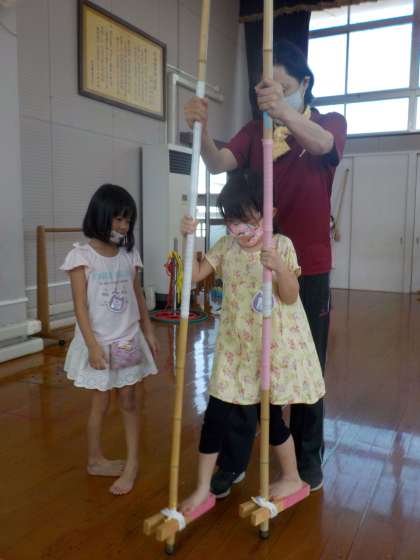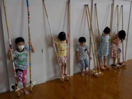 年長児は、6月の土曜参観でお家の方に作っていただいた竹馬に挑戦しています。まずは、壁にもたれて両足を竹馬に乗せるところからです。先生にも手伝ってもらい、お友達に見守られ、応援してもらっています。