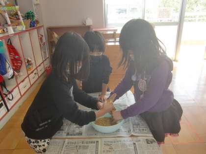 年長児すみれ組が、収穫したとうもろこしの実を取っていました。来週のポップコーンパーティの準備です。
