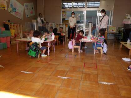 子どもたちの遊びや食事の様子を見られています。お仕事の合間を縫って、お父さんも少し、来てくださっていました。(3歳児は大人に見られて、いつもと違う雰囲気を感じ食事の場面は緊張していたようです)
